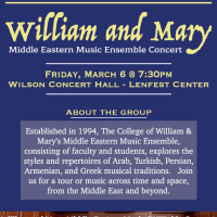 For decades, the Middle Eastern Music Ensemble at the College of William and Mary has brought together students, faculty, and community musicians in a unique musical collaboration. The group explores the styles and repertoires of Arab, Turkish, Persian, Armenian, and Greek musical traditions, offering performances that connect audiences with centuries of cultural expression. Join us for a journey through music across time and cultures, from the Middle East and beyond!